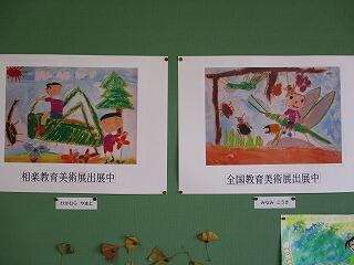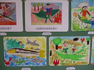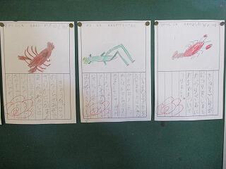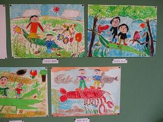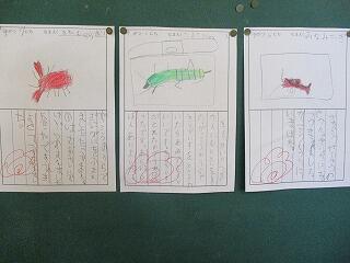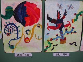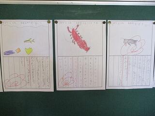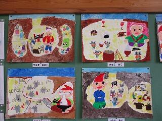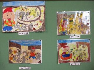 1,2年生が図工の学習で絵を描きました。1年生は、生活科の学習でふれあった昆虫や生き物と友達や自分を題材に描きました。2年生はお話の絵で、「おむすびころりん」のスットントンと穴に落ちたおじいさんとネズミたちの楽しい様子を描きました。どの作品も思い思いに伸び伸びと描けていて、絵からその思いが伝わってくるようです。