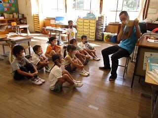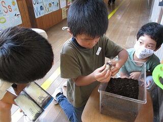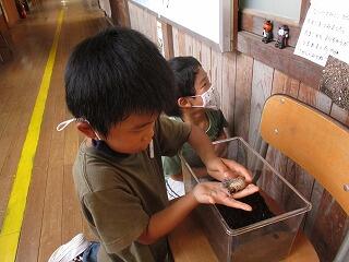 いづみ学級の前には、カブトの卵から生まれた幼虫が飼育されています。掃除のお手伝いに訪れた1年生は、そのさなぎを触っていい約束になっています。1年生の子どもたちは、ふにゅふにゅした感触を楽しみながら観察しています。
