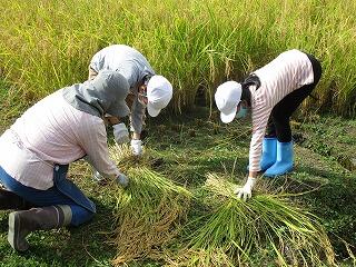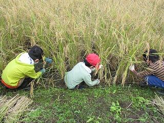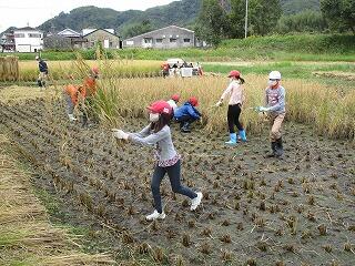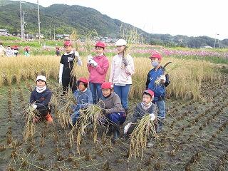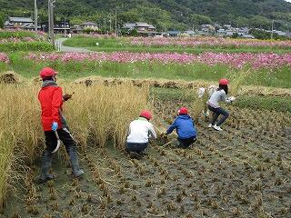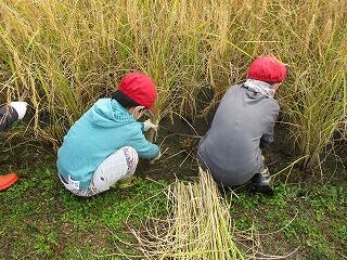 10月18日(月)の2校時は、5年生が稲刈りに取り組みました。5年生は総合的な学習に時間に、米作りについて1年間取り組んでいます。