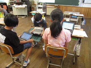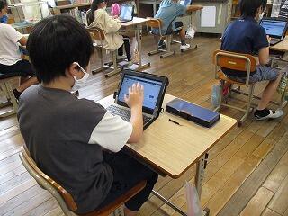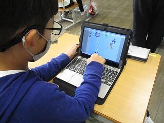 1人に1台ずつ配備されたタブレットの活用が進んでいます。授業では、自力解決の場面でタブレットに自分の考えや解き方を書き込み、それを活用してグループで話し合っています。各自の書き込みはグループやクラス全体でシェアすることができ、話し合い活動に活用することができます。授業の終わりには、習熟の練習問題をタブレットを使ってやることもしています。タブレット活用で授業も変わってきています。