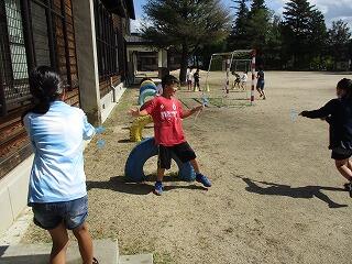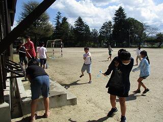 4年生は理科で、空気でっぽうを使って空気や水の圧縮について学習しました。そして、学習の最後に水でっぽうをして楽しみました。10月とは思えない暑さの中、爽やかな青空の下でキャーキャーはしゃぎながら水を掛けまくっていました。途中からは、チーム対抗のペットボトル落としゲームに大はしゃぎでした。