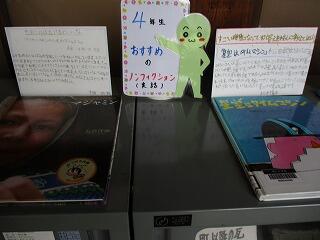 4年生は、国語の学習で実話の「お薦め本」の紹介カードを書きました。それを図書室前に本と一緒に展示して、お薦め本コーナーを作ってくれています。本にもいろいろなジャンルがあって、お気に入りのジャンルの本を読み進めるもよし、たまには、他のジャンルの本にも触れて知識や視野を広げるのもよし!この取組が、読書の幅を広げるきっかけになればよいと思います。