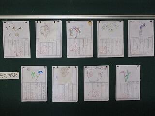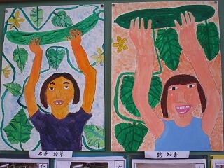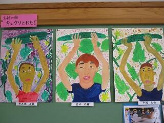 植木鉢でも立派なキュウリが実るものです。3年生は実ったキュウリを絵に描きました。キュウリの立体感や表情など、細かいところにも気を配りながら着色しました。できあがった絵は中学年らしく、嬉しそうに高々と掲げている様子が誇らしげです。
