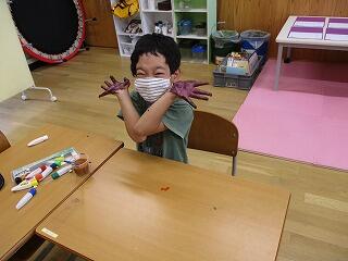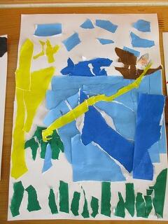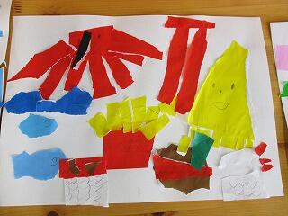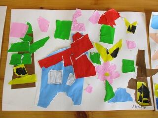 1年生は図工で、好きな色紙をちぎって見立て遊びを楽しみました。ちぎった紙の形から想像がどんどん広がって、ステキな世界ができあがりました。