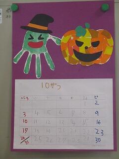 そして、いづみ学級から10月のカレンダーが届きました。10月と言えばハロウイン!手形のお化けと、貼り絵で作ったパンプキンがハロウインを演出しています。