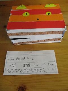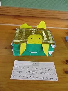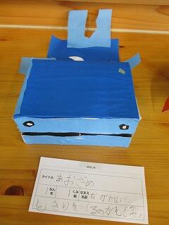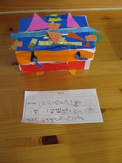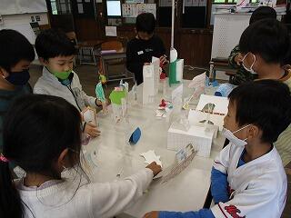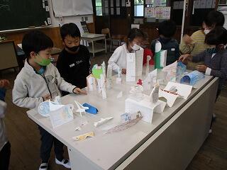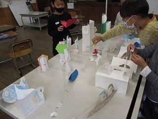 1年生は図工の学習で、画用紙を使って折って立つものを作りました。そして、それらを持ち寄りみんなで協力して町を作りました。海には船やラッコなどの生き物がいて、町にはビルや幼稚園、電車にトンネルなど、みんなで配置を考えステキな町ができあがりました。