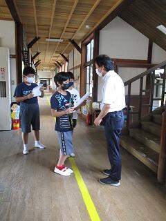 本日、無事に1学期の終了式を迎えました。子どもたちは、夏休みの準備とともに、1学期の学習の歩みである通知表を受け取りました。初めて通知表をもらう1年生は、ドキドキしながら自分の1学期間の頑張りを担任の先生から伝えてもらい、とても嬉しそうでした。
