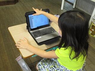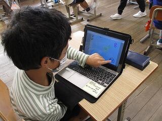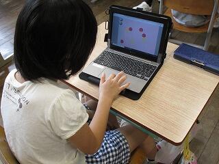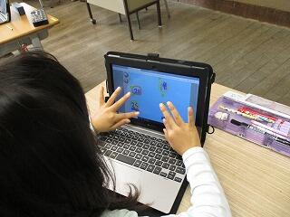 2年生はプログラミングの学習で、算数で学習している九九(5の段)を使ってシューティングゲームを各自作りました。発射した矢や玉、おにぎりなどが数字に当たると、5の段の数字の答えが表示される仕組みです。