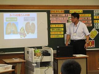 7月2日(金)の5校時に、京都府警のスクールサポーターさんにお世話になり、薬物乱用防止教室を行いました。たばこやお酒、薬物(大麻等)の健康被害について、具体的な事例や実際の写真等を提示いただきながらわかりやすく教えていただきました。誘われたらはっきりと断る大切さやたばこでは吸うことだけでなく、副流煙にも触れていただき、その怖さを知ることもできました。これからも、健康な体を大事にしたいですね。