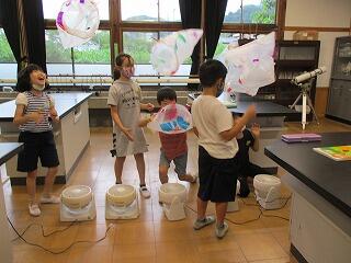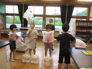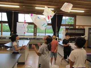 7月2日(金)の5校時に、3年生が図工で袋を使って制作した作品を理科で学習している風の力を利用して、高く飛ばす工夫をしました。飾りが風に揺れる様子がとてもかわいらしく涼しげでした。