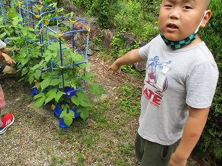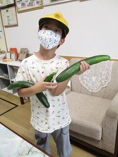 6月28日(月)、朝元気な声で「畑で採れました!」と、収穫した野菜を嬉しそうに見せに来てくれました。草引きや水やりなど、これまでお世話して収穫できるとうれしさも倍増です。ぴかぴか光った採れたて野菜は、とても美味しそうでした。