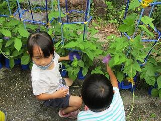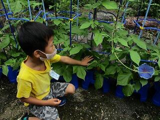 7月5日(月)、梅雨末期のどんよりとした朝を迎えました。が、それを吹き飛ばしてくれたのは1年生のはしゃぐ声!「朝顔の花が咲いたよ!」と、嬉しそうに報告しに来てくれました。行ってみると、いろいろな色の朝顔が、涼しげに咲いていました。