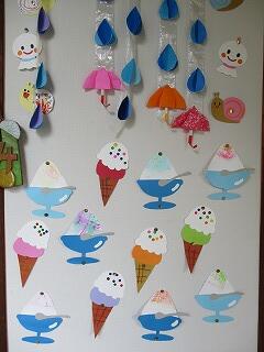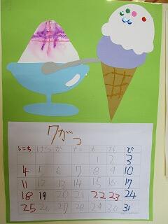 曇り空が続く中ですが、畑で栽培している野菜がすくすく成長しています。今朝は、いづみ学級の児童が収穫したキュウリやピーマンを見せに来てくれました。大きく実った夏の贈り物を手にして、とても嬉しそうでした。校長室には、他にもいづみ学級から夏の贈り物が届いています。それは、夏の風物のかき氷やアイスを飾った手作りカレンダーです。いづみ学級前の掲示板にも飾られていて、それを毎日ながめながら涼んでいます。