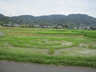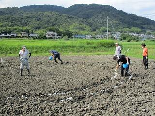 瓶原町づくり協議会の方々にお世話になり、昨日に子どもたちが考えた下絵を描いていただきました。今日は1時間目から、子どもたちがその下絵にコスモスの種を手分けしながら蒔きました。今年は大きな太陽のニコちゃんマークです。このマークのように、子どもたちが元気いっぱい学び、活動する1年になることを願っています。