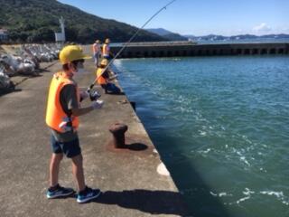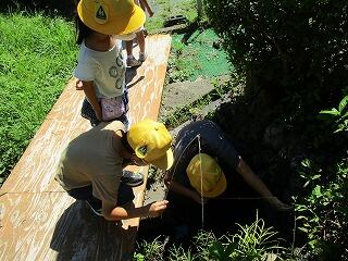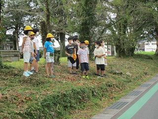 9月10日(金)、今日は朝から爽やかな天気で青空が広がっています。昼休みには、1年生が学校敷地内の溝に手作りの釣り竿をつるし、ザリガニ釣りに興じていました。スルメを付けた糸を一生懸命つるすのですが、なかなか思うようにはつれません。それでも、諦めず自分の順番を気長に待ちながら、友達を応援していました。