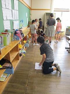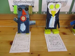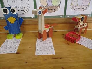 今日の2,3校時に、2年生が手作りおもちゃコーナーを準備し、1年生を招待してくれました。コーナーは、ぴょんぴょんがえるや紙とんぼ、食材つりやカタカタ乾電池くるまです。各コーナーでは、おもちゃの作り方や遊び方を2年生が説明してくれます。1年生は分からないことなども質問し、2年生はその度に考えて対応していました。2年生は楽しんでもらえてよかった。1年生はいっぱい遊んで楽しかった!と感想を言っていました。