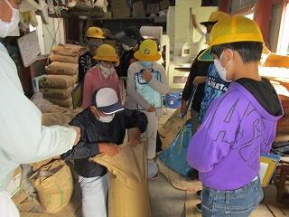 米作りの学習で5年生がもみすりについて学びました。松本さん、石﨑さんにお世話になり、機械でのもみすりを見学して袋詰めを体験しました。最後にお米がずっしりと入った袋を学校に届けていただきました。
