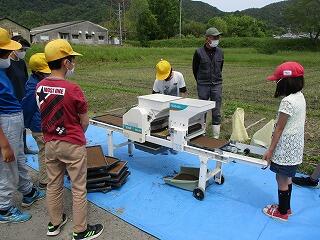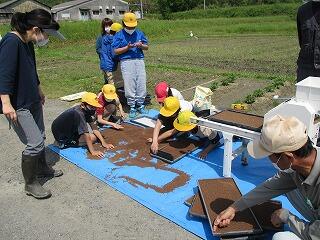 5月11日(火)の2校時に、地域の松本さんと石﨑さんにお世話になり、5年生が総合的な学習の時間に籾まきをしました。育苗箱に入れる土の量や籾まき機の仕組みを教えていただき、みんなで協力して準備を進めました。最後には育苗箱を、用意していただいた苗代に並べました。発芽し、苗に成長するのが楽しみです。