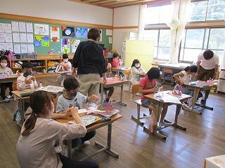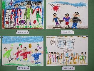 5月も最終日。朝から教室を巡って元気いっぱい挨拶をする1年生。休み時間になると、外に飛び出していきます。授業中も張り切って学習する声が校舎中に響いています。そんな1年生が、休み時間に友達と遊んでいる様子を絵に表しました。