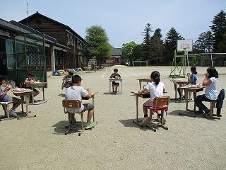 4月23日(金)、6年生は校庭で青空給食です!自分たちが選んだ場所に机と椅子を運び、青空教室で給食を食べました。普段は黙食ですが、この日は戸外で間隔も十分に確保でき、楽しい話等で盛り上がりました。