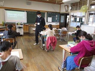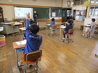 今年度の高学年の外国語は、2年生の福井先生に専科指導をしてもらっています。この日の6年生は、友達に「どこにすんでいるの?」や「日曜日、何しているの?」など、英語で質問して答えていました。なかなか覚えるのが大変ですが、ジェスチャーを入れるとわかりやすくなります。