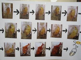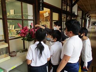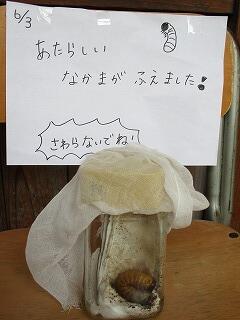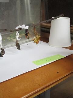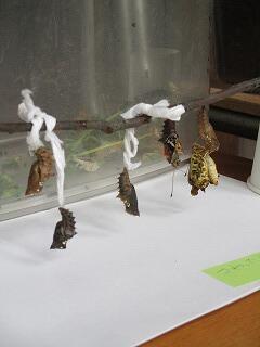 いづみ学級の教室の前には、昆虫の幼虫やさなぎなどが展示されています。今は、ツマグロヒョウモンとカブトです。ツマグロヒョウモンは幼虫とさなぎで、さなぎの背はまばらに金色の斑点があり光り輝いています。カブトは、幼虫からさなぎに変態途中です。子どもたちは廊下を通る度に、興味津々の様子で観察しています。