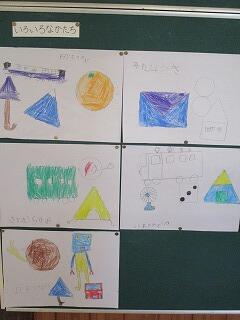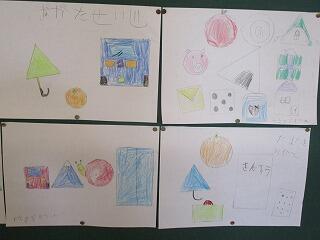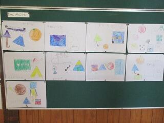 1年生は、算数で形の学習をしています。四角や丸の形の特徴を学んだ後、形を写し取って、いろいろな物見立てて絵に描きました。1年生の想像力の豊かさに驚きます。