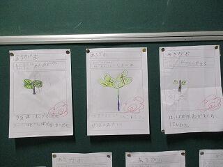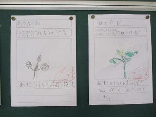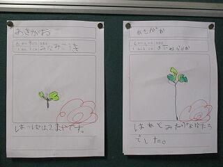 種まきをした朝顔が芽を出して、1年生は大喜びで毎日水やりをしています。先日の生活科では、触った感じや形など、よく観察して思い思いに気づいたことを表現していました。