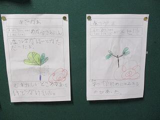 種を蒔いて大事に育てている朝顔のツルが伸びてきました。1年生は毎朝水やりをしながら、その成長を確かめています。そして、生活科の時間に観察をして、成長の記録を残しています。きれいな花が咲くのが楽しみです。