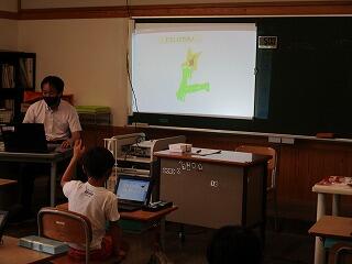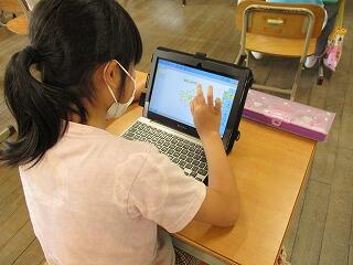 2年生は1人1台ずつのタブレットを自分で起動させ、お絵かきをして提出する練習をしました。パソコンで提出した自分の絵が、教室前のスクリーンに映し出されると、「○○ちゃん、上手!」など、感心しながら見入っていました。使い方にも少しずつ慣れて、自分が表現したことをみんなで共有しながら学び合っていきます。
