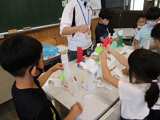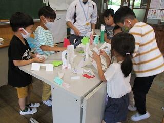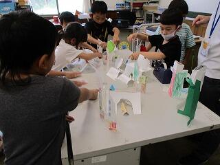図工の学習で、二つに折った画用紙にいろいろな物を書き込んで、それを切ってビルや橋、車やロケットなど立つものを作りました。そして、今日は一人ひとりが作ったものを合わせて町を作りました。思い思いに自分で作ったものを置いていき、ステキな1年生の未来都市ができ上がりました。