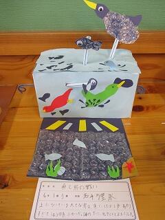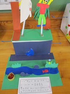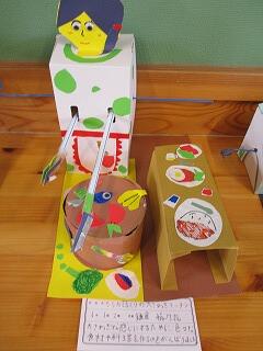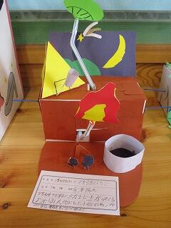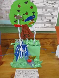 6年生が、レバーをくるくる回すと上下に動く仕組みを利用して、自分の思い思いの世界を作りました。細かい飾りを工夫し、タイトルも面白くて、さすが6年生です。