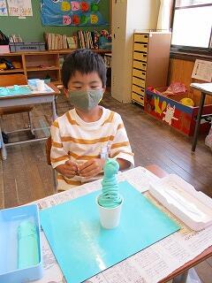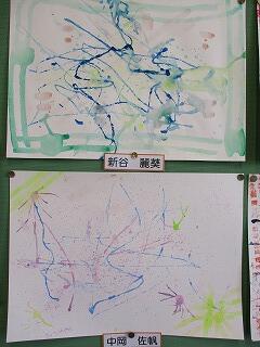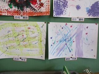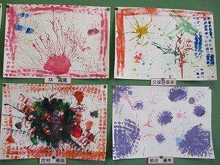 4年生は、図工の学習でいろいろな物や技法を使って絵の具で描きました。ブラシではじいたり、吹いたりと絵の具の色合いと模様を考えながらも、偶然できる美しさも味わいながら楽しいんで描きました。