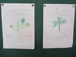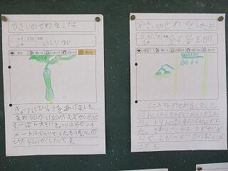 生活科の時間に植えた野菜に実ができました。立派に育つ野菜に大喜びの2年生です。毎朝、欠かさずに水やりをしている頑張りの成果ですね。