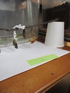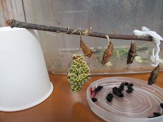 6月15日(火)、登校してきた子どもたちが、いづみ学級の前に集まって大騒ぎ!幼虫からさなぎになってぶら下がっていたさなぎから、チョウが羽化していました。
