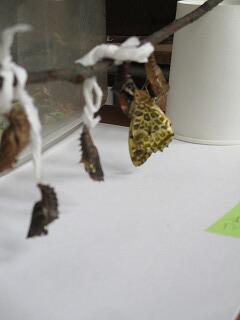 しばらくすると、ポロンと人間の赤ちゃんが生まれてくるように、さなぎから羽がくしゃくしゃのチョウが羽化しました。そして、時間を掛けて羽を伸ばしていきました。