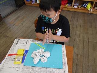 今日のクラブは、創作と音楽です。創作クラブは、くるくる風で動くおもちゃの設計図から自分で書き、組み立てて風であおって転がしました。上手く転がらない子は、何度も修正しながら試していました。