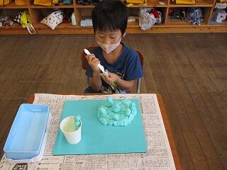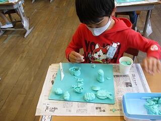 1年生が図工の時間に、粘土で「お食事パーティー」の準備をしました。どの子もとても楽しそうに創造を働かせて一生懸命に、フライドポテトやお寿司、ケーキ等、自分が食べたいもの等を机の上いっぱい作っていました。みんなが作ったものを全部集めて、ステキなパーティーが始まります!!
