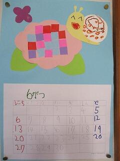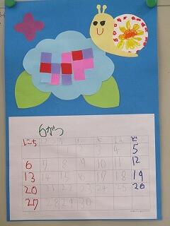 いづみ学級の市太郎さんから、毎月ステキな贈り物が届きます。それは季節感あふれる手作りカレンダーで、職員室や保健室、校長室に届けてくれます。6月のカレンダーは、梅雨の季節らしくあじさいとカタツムリです。あじさいの花を小さく切ってのり付けし、カタツムリの模様や顔を描きました。1枚1枚、花やカタツムリの表情が違い趣を醸し出しています。