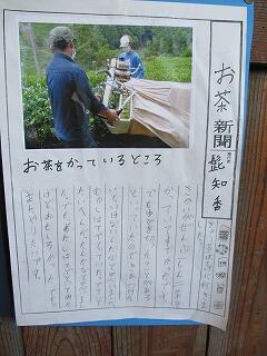 先日、総合的な学習の時間に地域の炭本さんにお世話になり、茶畑や茶工場の見学をさせていただきました。茶畑では茶摘みもさせていただき、摘み立てのお茶の香りを味わいました。また、茶工場では、摘んだお茶の加工の仕方を教えていただきました。4年生は、学んだことを新聞にまとめました。