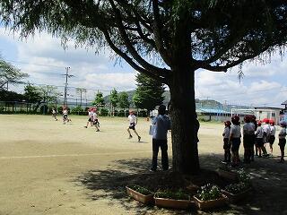 5月26日(水)の1校時、1,4年生が青空の下でシャトルランを実施しました。1年生は初めてのシャトルランで、4年生に手本を見せてもらい張り切って取り組みました。4年生が精一杯走っている姿に、1年生が声援を送っていて、とても微笑ましかったです。