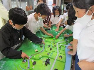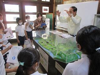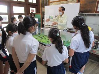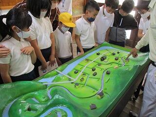 社会科と総合学習を兼ねて、地域の石﨑さんに講師としてお世話になり、地域を流れる大井手用水の仕組みについて教えていただきました。学校にある恭仁のジオラマを使って実際に水を流し、本流から水を取り入れる「頭首工」や「サイフォン」の仕組み、水量調節のための「はずし」や「千本杭」、洪水に備えるための「ふね」の仕組みなどを観察しました。子どもたちは、地域を流れる用水路の工夫についてたくさん学び、感心していました。