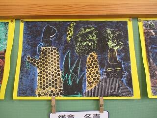 3年生の版画が仕上がりました。3年生はいろいろな素材を貼り合わせて版を作りました。刷り上げた後に裏から絵の具で着色し、自分のイメージした世界を表現しました。