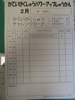 2月18日(木)から24日(水)までは、家庭学習パワーアップ週間です。自分で計画して自主的に学習する力を付けるために、自主学習にも取り組みます。各家庭では、時間を決めて集中して学習ができるような環境の整備のご協力よろしくお願いします。