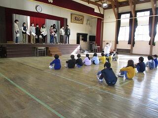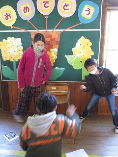 3月17日(水)の1校時に、もうすぐ卒業していき6年生と低学年がお別れの交流会をしました。6年生が外国語で学んだ英語劇「桃太郎」を披露し、その後はしっぽ取り鬼をして楽しみました。低学年にとって、6年生は本当に頼りになるお兄さん、お姉さんでした。今までたくさんお世話になりました。ありがとう。