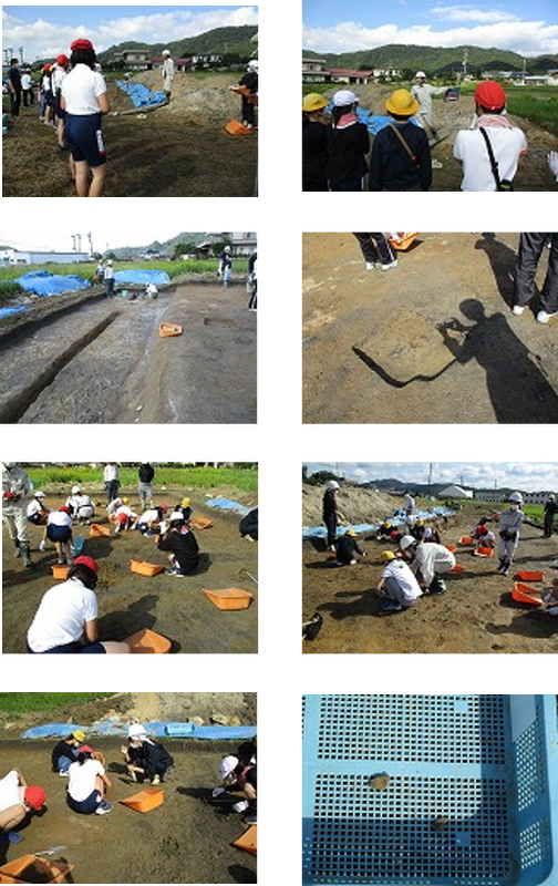 発掘の方法を調査員の方に教えてもらいながら、専用の道具で丁寧に土をかき分けていきます。その中に、1~2センチ四方の土器を発見!!土を掘れば掘るほど、過去にタイムスリップし、歴史のロマンが広がります。