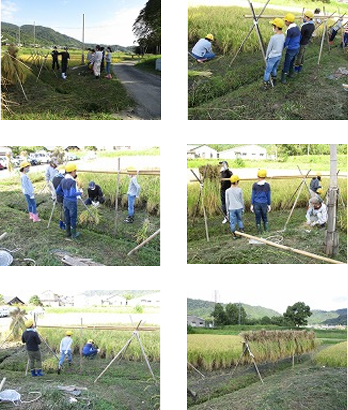 10月13日(火)の1校時、5年生が地域の松本さんにお世話になり、種もみ取りを行いました。この日は朝から秋空が広がり、黄金色に実った稲も秋風に揺れていました。5年生は早速、教えていただいたように鎌を持って種もみ用の稲を刈り取り、そして、藁で縛っていきました。束ねるのが難しく悪戦苦闘していましたが、稲木には少しずつ刈り取った稲が干されていきました。