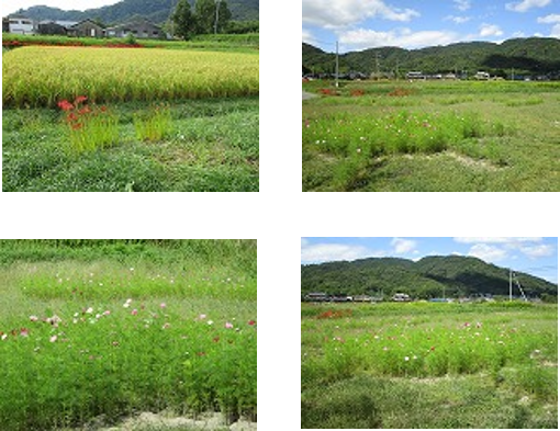 3,4年生が育てているコスモスの花が秋風に揺れています。学校近くの学校田は黄金色に輝き、畦道には彼岸花。そして、コスモス畑は3,4年生が種まきや草引きをしたコスモスの太陽や星、「クニゲンキ」がのどかに秋の訪れを知らせてくれ、里山の素晴らしい景色に心癒されます。