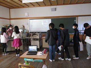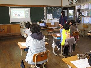 3月15日(火)の3校時に、広島県の仁賀小学校の5,6年とオンラインで交流をしました。6年生が学校や校区の紹介をして、4~6年生が〇✕クイズをしました。遠く離れていても、オンラインですぐにつながることができ、顔も見ながらのステキな交流となりました。