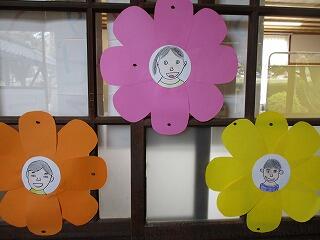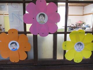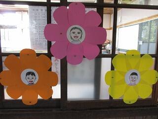 1年生が卒業と入学をお祝いしようと、自分の似顔絵飾りを作りました。自分をよく見て描いていて、どれも本人にとてもよく似ています。